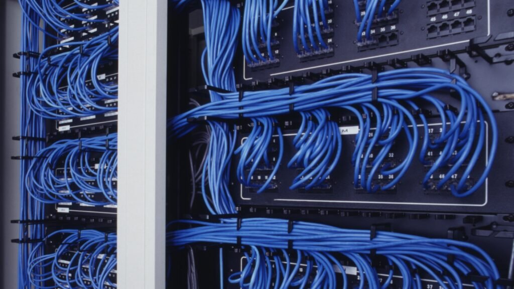 Cabeamento estruturado, fibra óptica e infraestrutura de telecomunicações, switches e roteadores empresariais.